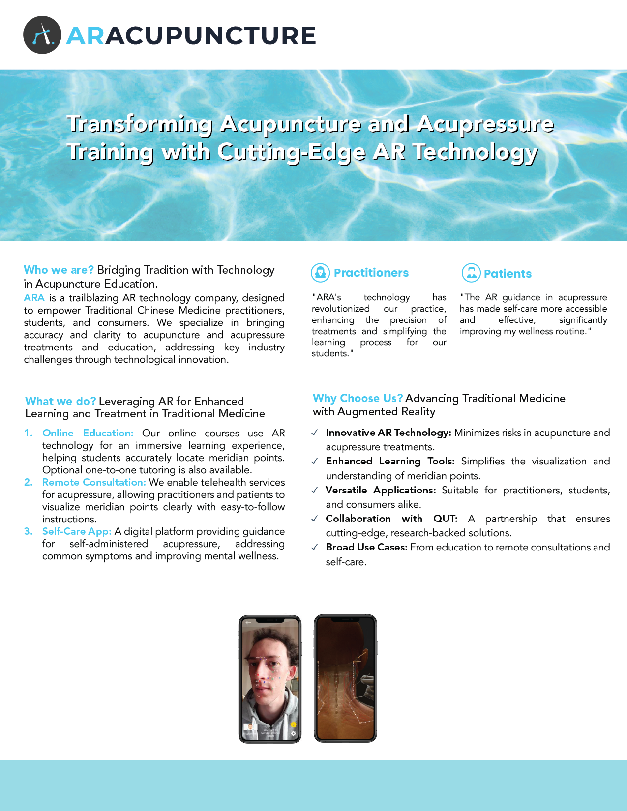 From a technology perspective, AR Acupuncture integrates spatial recognition, adaptive body mapping, and interactive guidance to ensure accuracy across different body types and use cases. From a healthcare perspective, it contributes to preventative care, reduces unnecessary clinical visits, and aligns with global trends toward digital-first, patient-empowered health solutions.