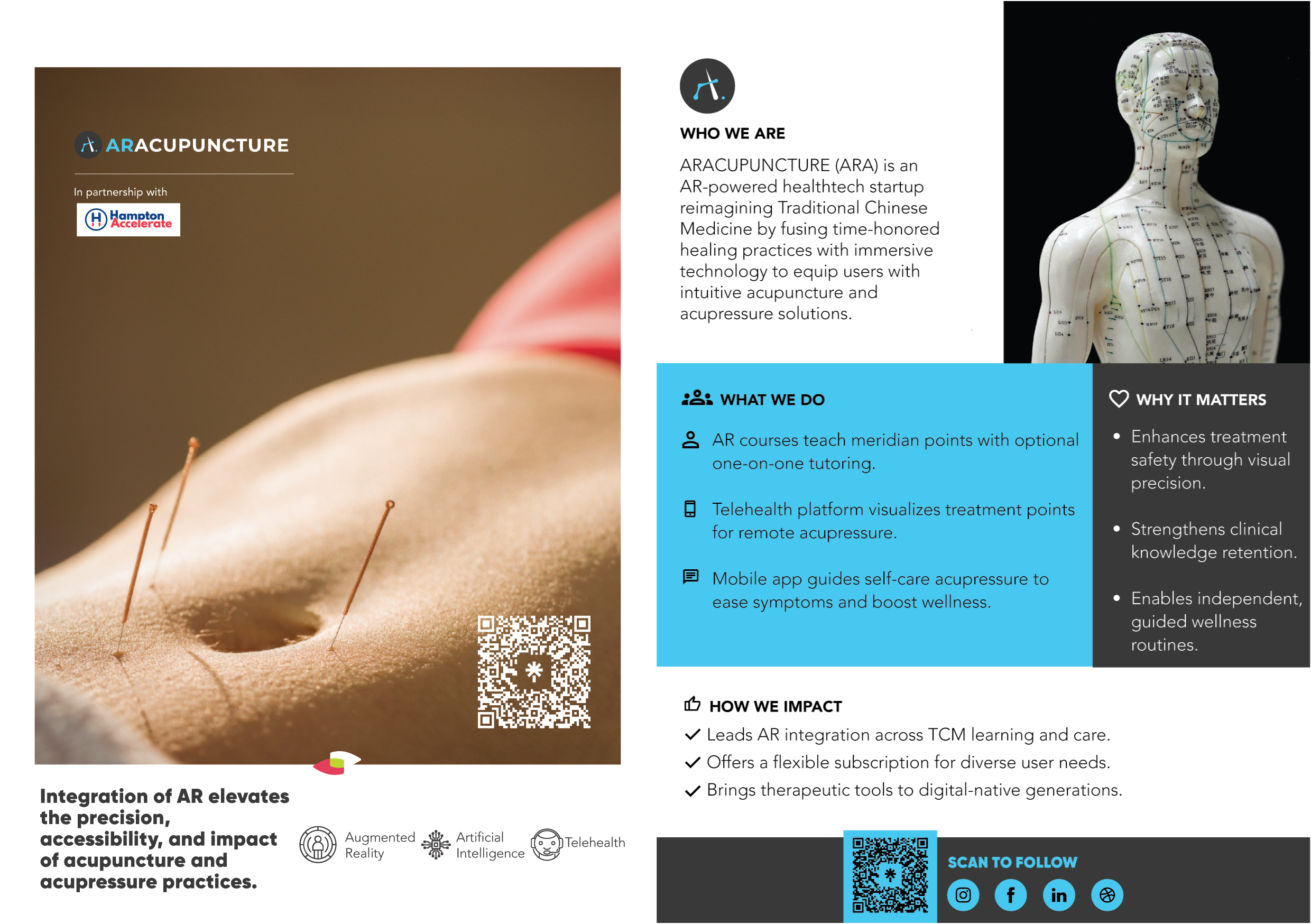 Traditionally, acupuncture requires in-person clinical expertise, limiting accessibility for rural populations, time-constrained patients, and preventative care users. AR Acupuncture addresses this gap by enabling users to accurately locate acupuncture points on the human body through real-time AR guidance using a mobile device. By overlaying validated anatomical and meridian data directly onto the user’s body, the platform transforms complex therapeutic knowledge into an intuitive, guided, and safe self-care experience.
