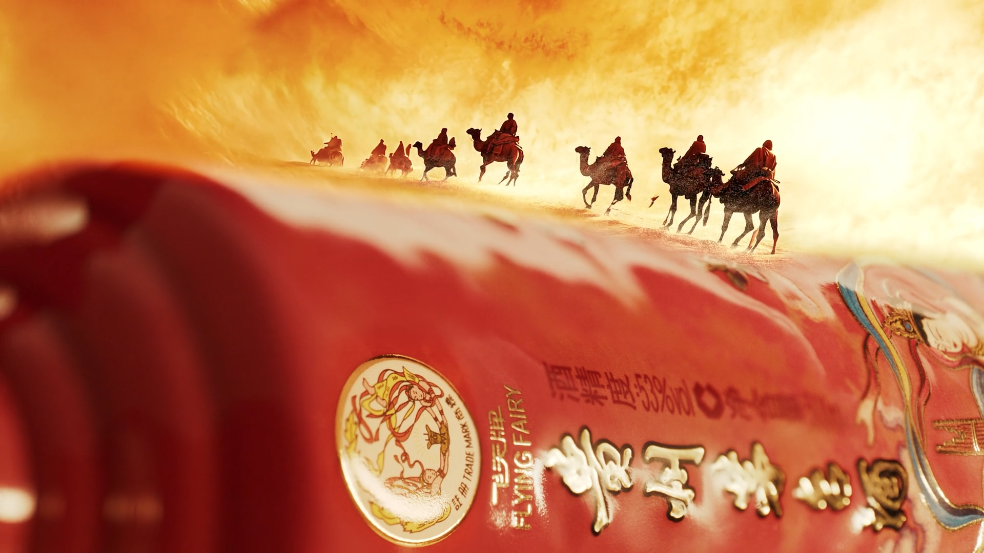 Technically, the video combines advanced 3D visual effects, live-action cinematography, and Unreal Engine, greatly expanding the aesthetic possibilities of baijiu advertising. The graceful movements of the flying fairy resonate with the product’s decorative motifs through computer graphics, transforming intricate textures, colors, and static patterns into vibrant, dynamic visual symbols. The video’s tonal palette is meticulously matched to the product’s colors, paired with the video’s editing rhythm and original score to convey the ancient and mysterious aura of Dunhuang.