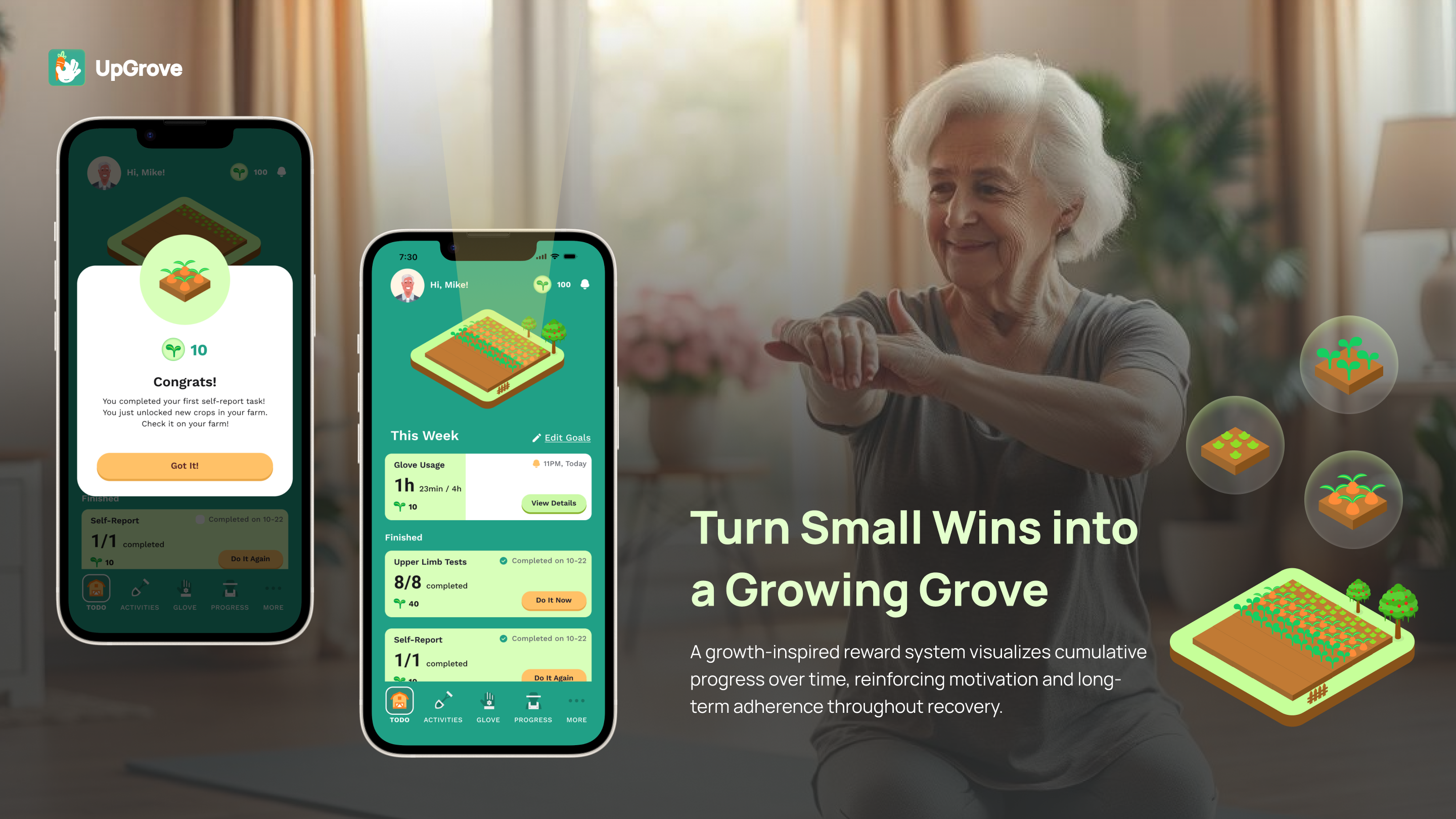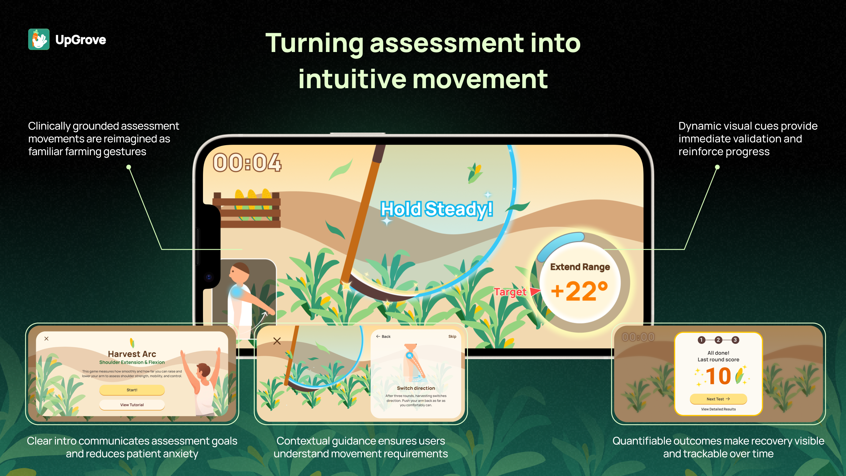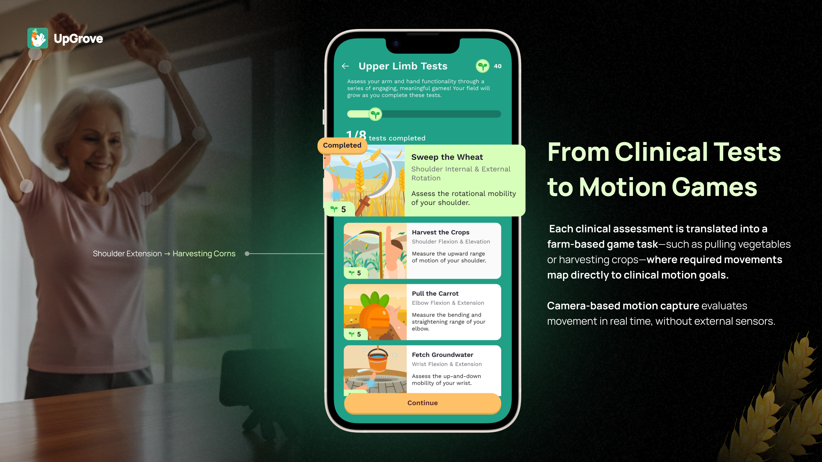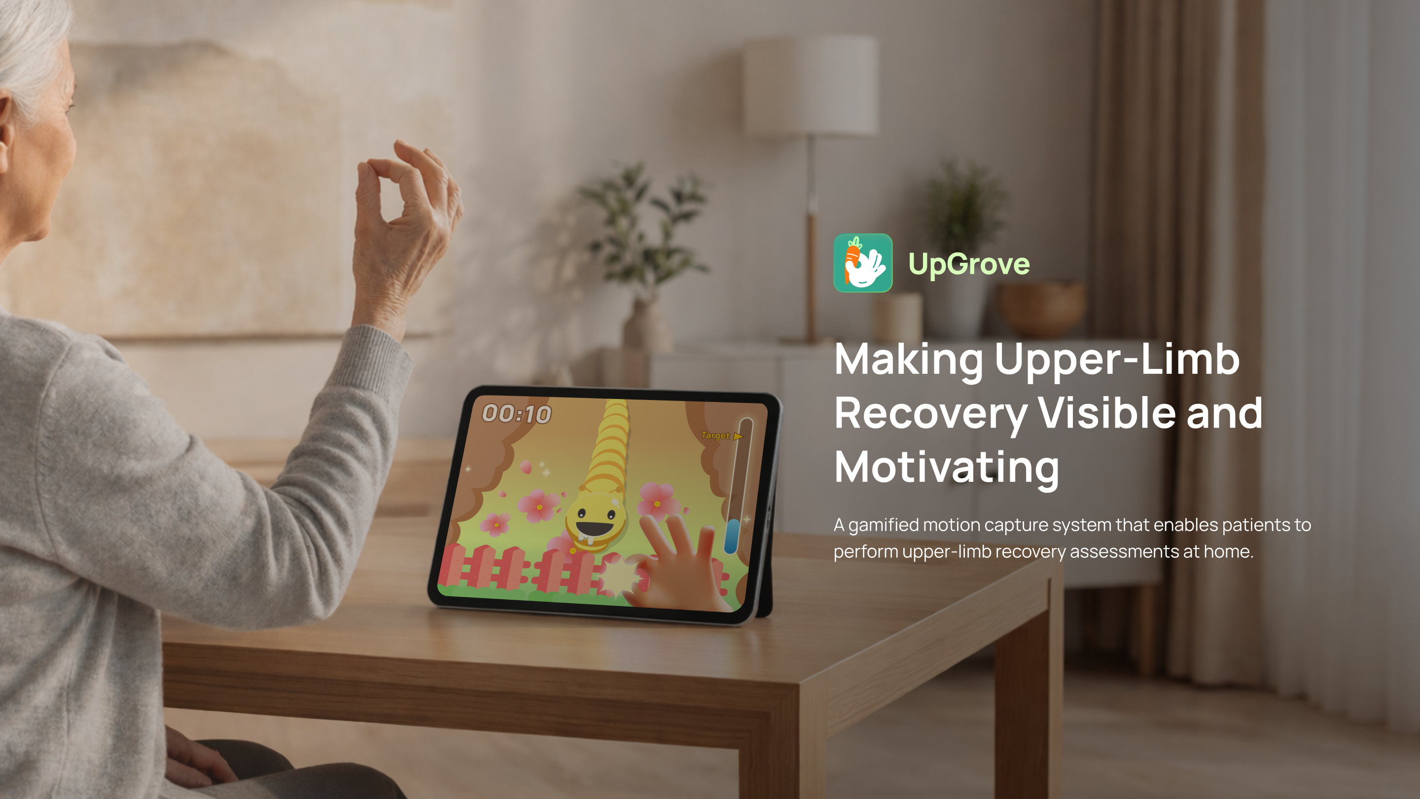 UpGrove bridges this gap by transforming clinically validated upper-limb assessments into orchard-themed interactive games powered by smartphone-based motion capture. Through intuitive tasks inspired by natural farming metaphors—such as harvesting crops, picking fruit, and watering plants—patients perform essential upper-limb movements while the system automatically captures, analyzes, and visualizes their performance. Patients and their caregivers receive immediate visual feedback, progress summaries, and personalized insights, enabling them to clearly see their self-recovery progress over time and stay motivated.