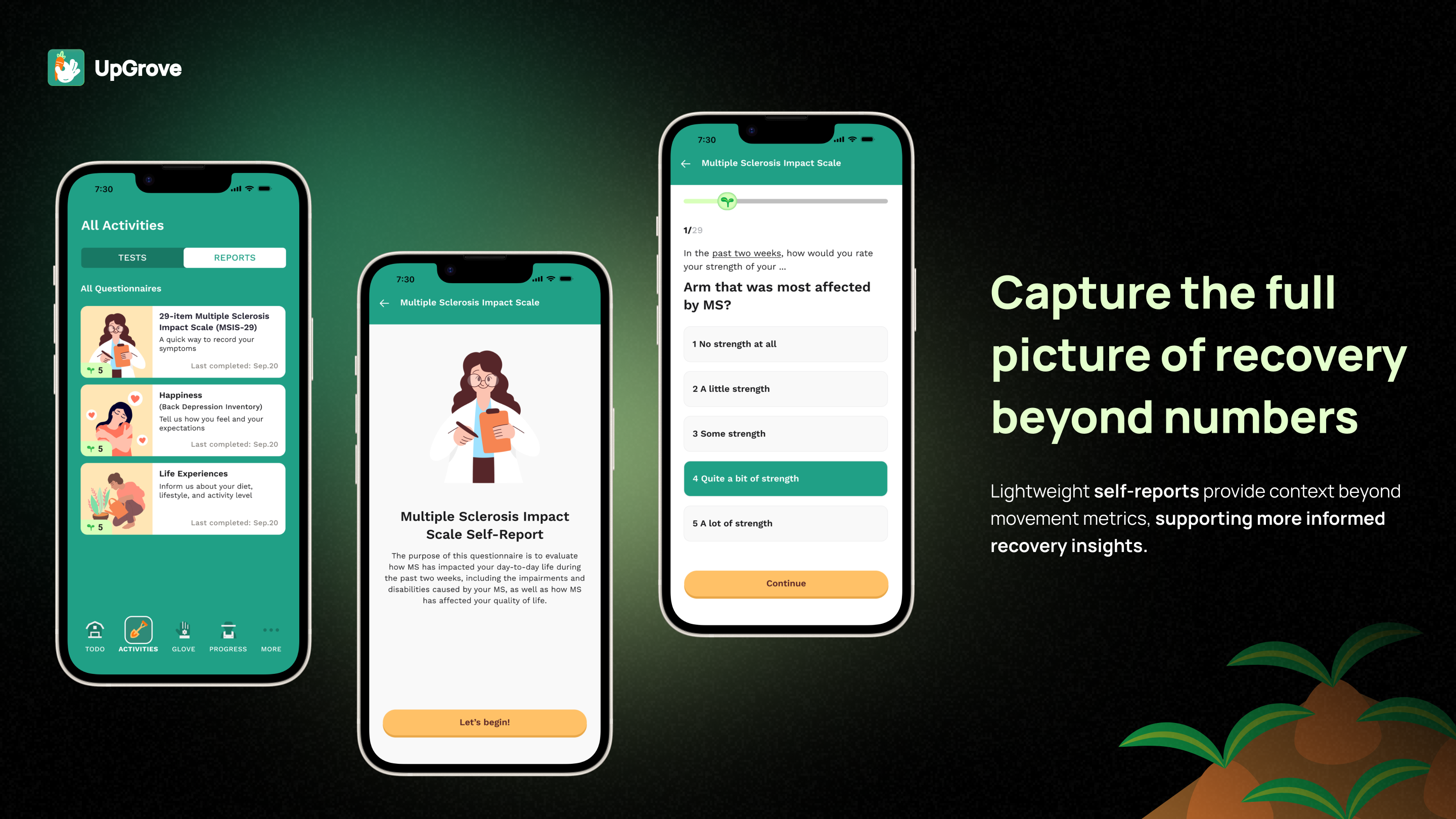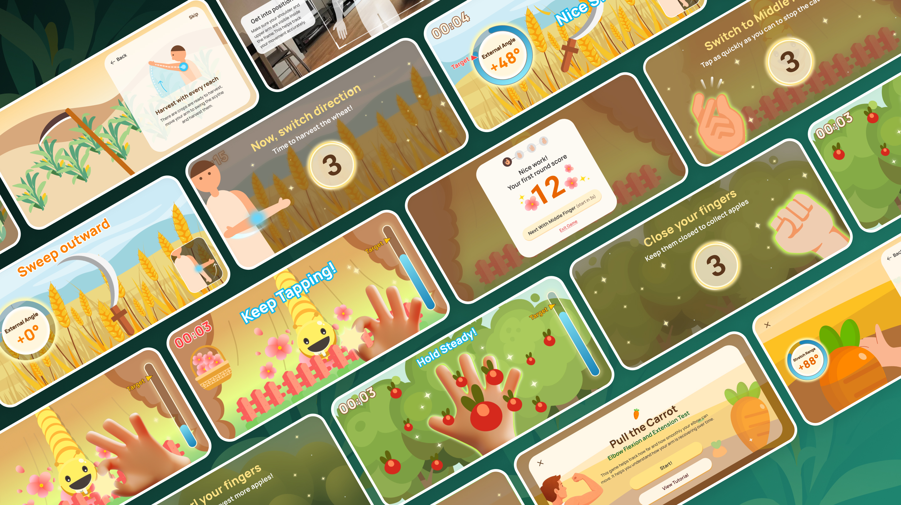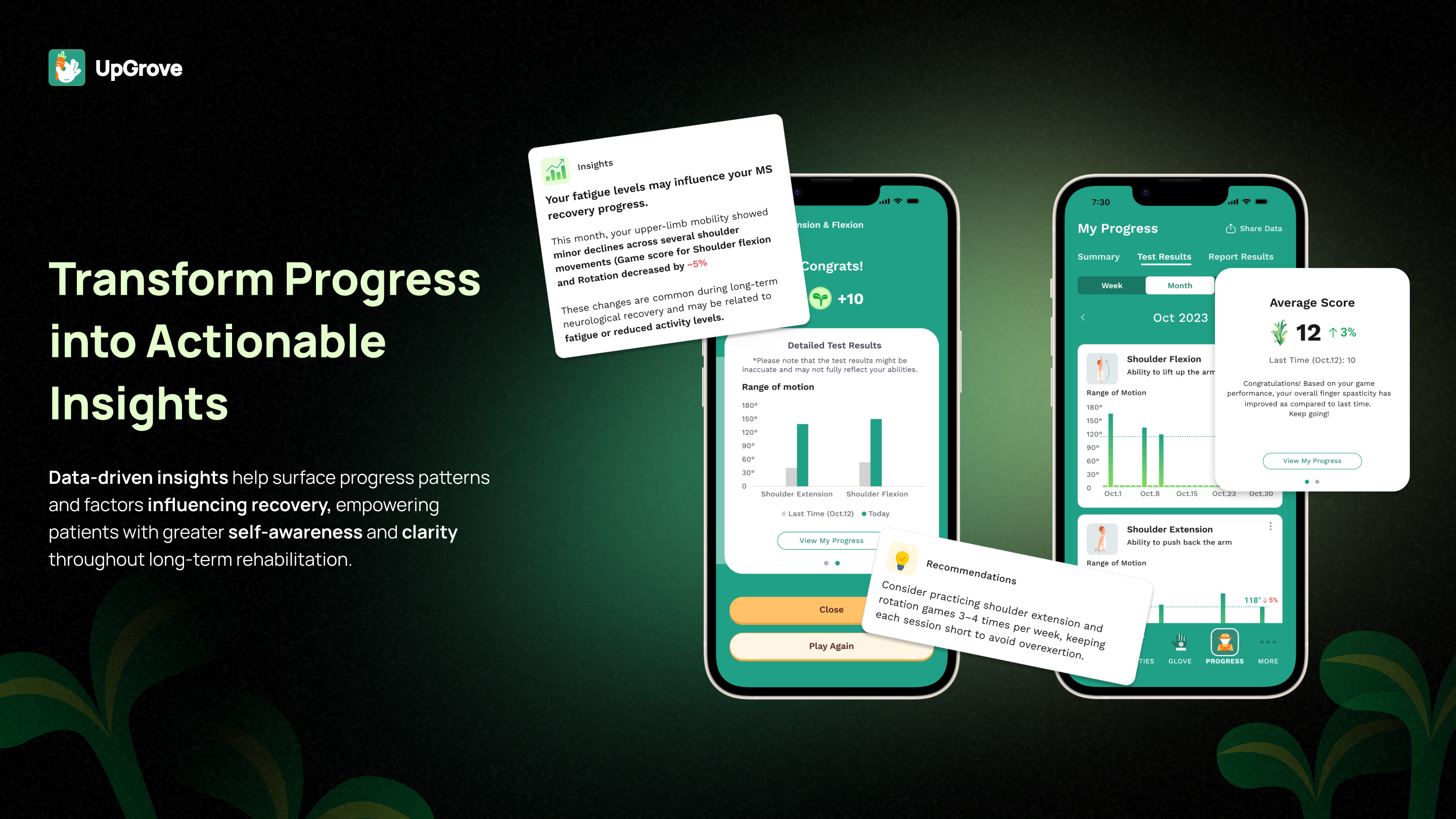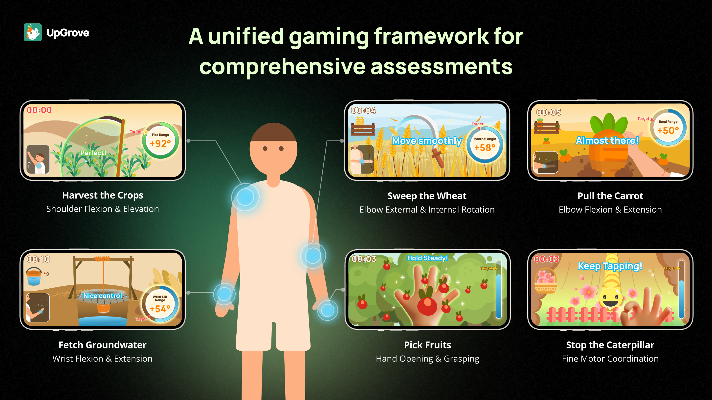 UpGrove bridges this gap by transforming clinically validated upper-limb assessments into orchard-themed interactive games powered by smartphone-based motion capture. Through intuitive tasks inspired by natural farming metaphors—such as harvesting crops, picking fruit, and watering plants—patients perform essential upper-limb movements while the system automatically captures, analyzes, and visualizes their performance. Patients and their caregivers receive immediate visual feedback, progress summaries, and personalized insights, enabling them to clearly see their self-recovery progress over time and stay motivated.