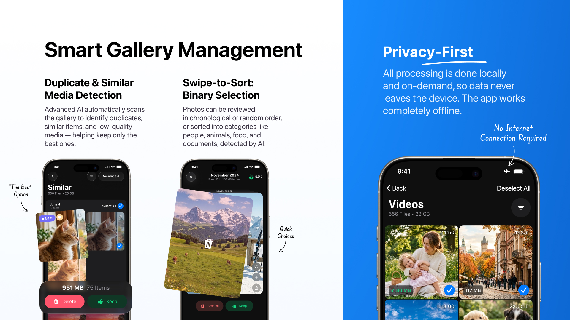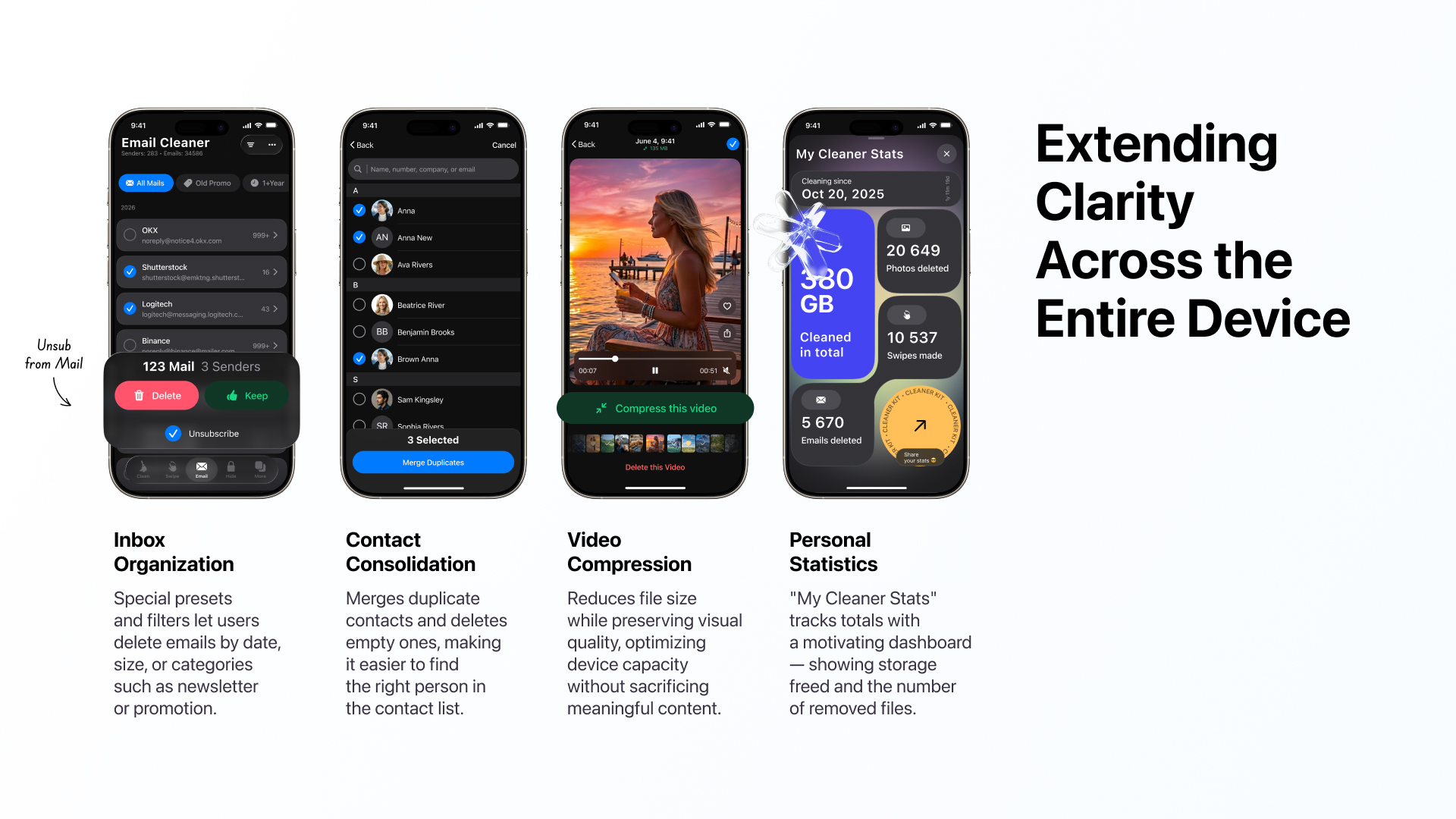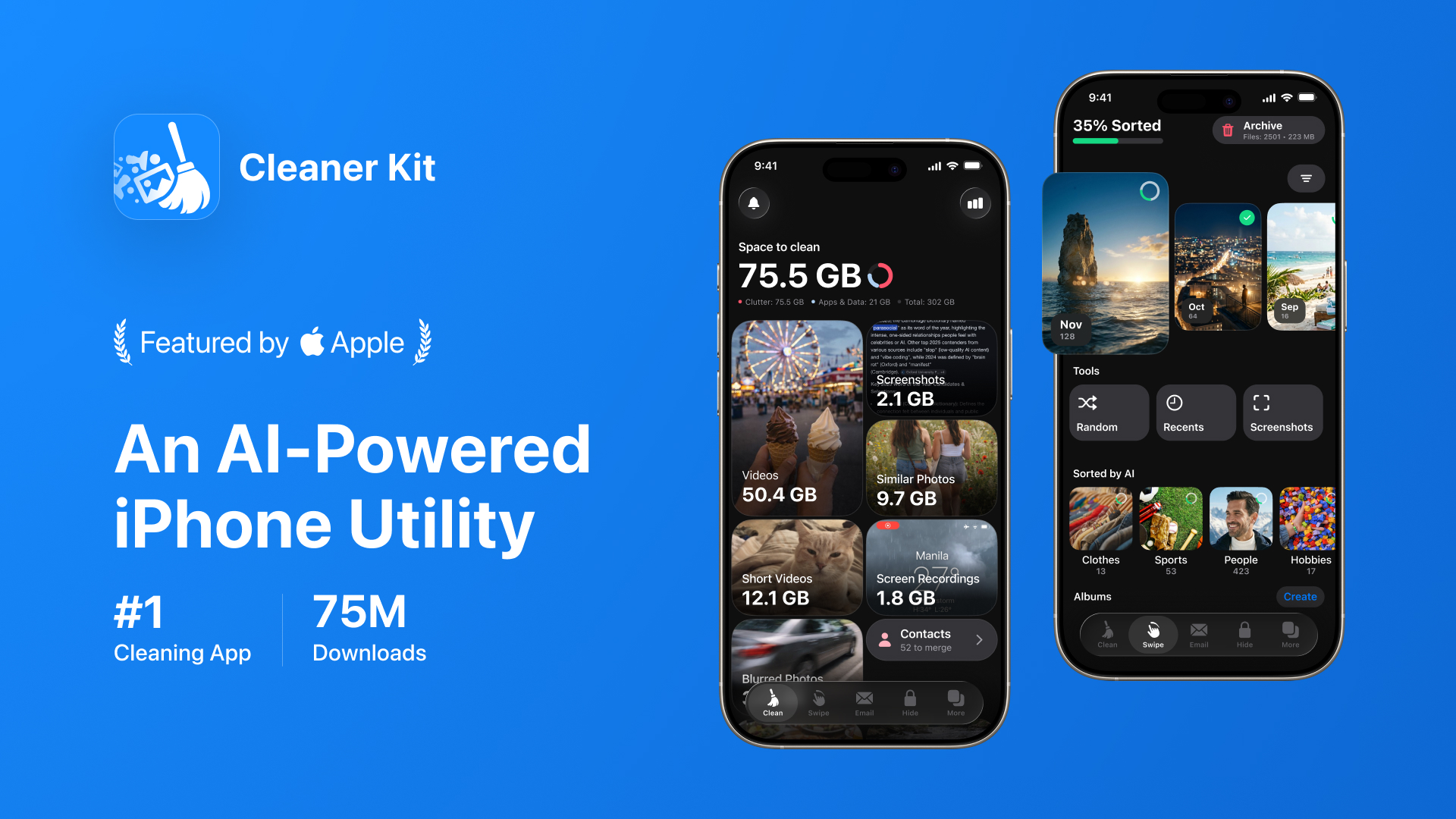 Unlike manual cleanup, which requires users to sift through years of accumulated media and data, Cleaner Kit provides a guided and intuitive experience. Intelligent on-device AI automatically identifies what can be reviewed, organized, or removed—helping users make faster decisions with minimal effort.