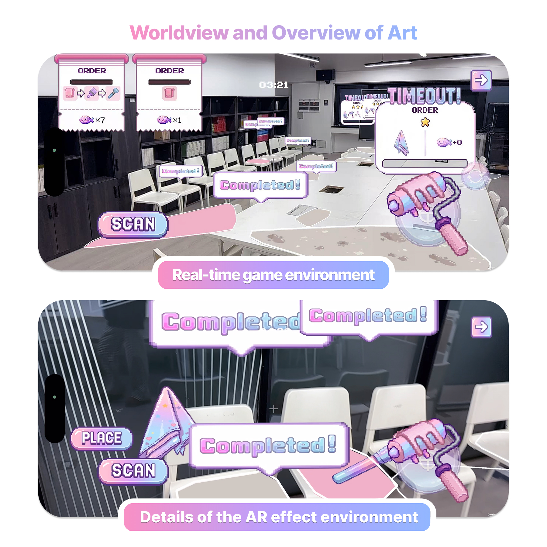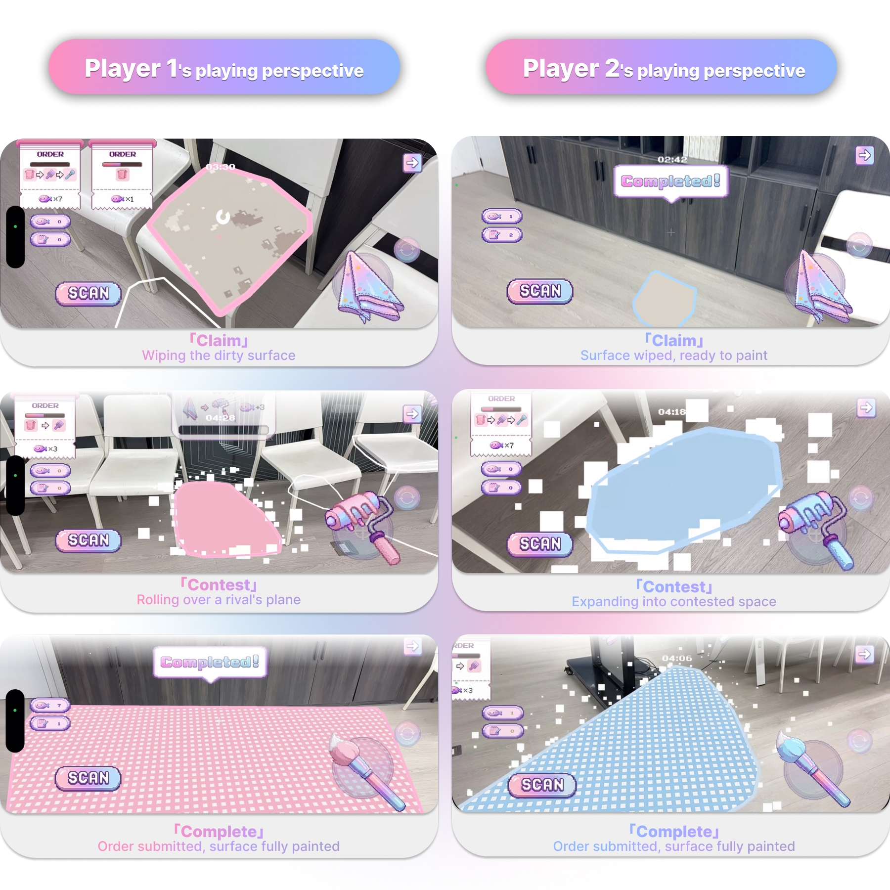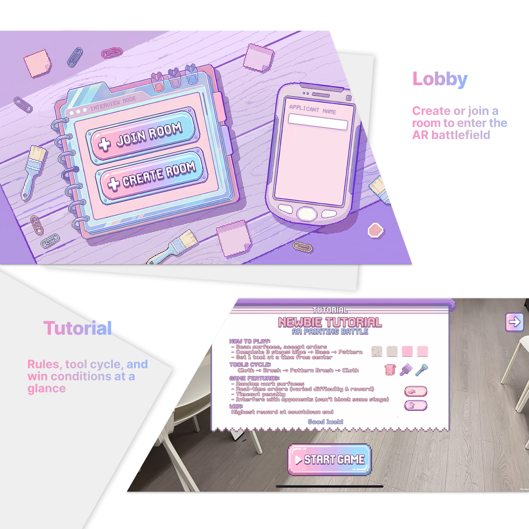 Built in Unity 2022.3 with AR Foundation 5.1, the game supports 2–4 players on iOS and Android with a custom Shadow Plane Protocol that synchronizes AR plane detection across devices, reducing inconsistency errors from 40% to under 3%. The 16-bit pixel art UI in a soft macaron palette keeps the experience visually approachable while maintaining clear information hierarchy.