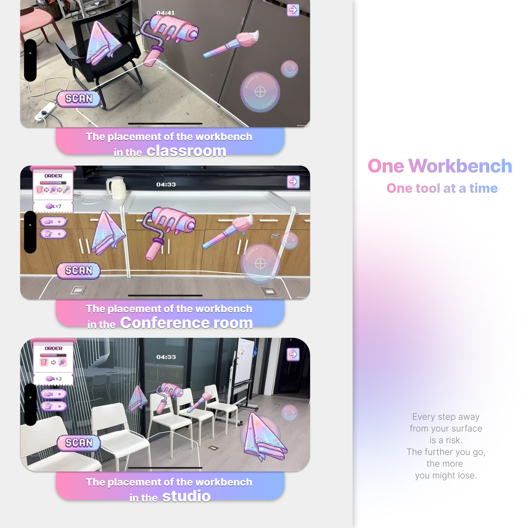 The central design innovation is a shared virtual workbench — the only location where players can switch tools. This single spatial constraint forces players to physically leave their claimed surfaces, creating moments of vulnerability that opponents can exploit. In the first playtest session using this mechanic, a player spontaneously shouted "Don't touch my table" — the kind of emergent social moment that no scripted content could produce.